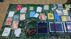 सुरक्षाबलों को सर्चिंग के दौरान जंगल में बीजीएल राउण्ड, इलेक्ट्रानिक डेटोनेटर, बैटरी, सोलर प्लेट, नक्सली दस्तावेज, नक्सली वर्दी, वायर, बेटरी, स्वीच, कैंची, कुल्हाड़ी जैसे अन्य समाग्री बरामद हुये।