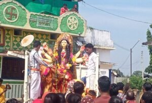 गरियाबंद। दर्रीपारा क्षेत्र माँ दुर्गा की नौ दिनों तक भक्ति भाव से पूजा अर्चना के बाद भक्तों ने नम आँखों से माँ दुर्गा की प्रतिमा को विसर्जित किया, ग्राम दर्रीपारा सहित आस पास के गांव में नौ दिनों से स्थापित दुर्गा की प्रतिमाओं को वाहनों में सजावट कर झांकी निकाली गई, ग्रामीणों द्वारा जस गीत, अबीर ग़ुलाल उड़ाते हुए तालाब पहुंचे, साथ ही पूजा -अर्चना के बाद प्रतिमा का विसर्जन किया, जहाँ भक्तों ने भंडारा का भी आयोजन किया गया, ग्राम कोसमी, खरता, आमदी,मोहलाई आदि गाँवो में दुर्गा प्रतिमा की स्थापना की गई थी, पंडालों को आकर्षक ढंग से सजाया गया था। माता को गाजे बाजे के साथ किया विदाई।