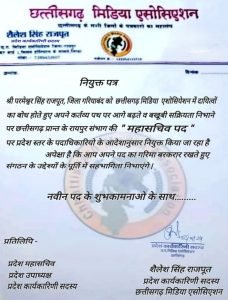 गरियाबंद। ज़िले के छुरा (हीराबतर) निवासी को छत्तीसगढ़ मिडिया एसोसिएशन महासंघ के दायित्वों, निर्वहन एवं सक्रियता को देखते हुए प्रदेश महासचिव अखिलेश रात्रे, प्रदेश उपाध्यक्ष वेदभुषण स्नेही, प्रदेश कार्यकारिणी सदस्य छायाकांत भट्ट, शैलेश राजपूत, एवं रायपुर संभाग अध्यक्ष दीनदयाल साहू के नेतृत्व में छत्तीसगढ़ प्रांत के रायपुर संभाग के महासचिव पद पर नियुक्त की गई है।