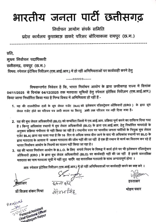 रायपुर। छत्तीसगढ़ में चल रहे एसआईआर (सिटिजन इन्फॉर्मेशन रिपोर्ट) सर्वे को लेकर राजनीतिक सरगर्मी तेज हो गई है। प्रदेश भाजपा ने सर्वे में गंभीर अनियमितताओं का आरोप लगाते हुए मुख्य निर्वाचन अधिकारी को औपचारिक रूप से लिखित शिकायत सौंपी है। भाजपा का कहना है कि यह सर्वे निर्वाचन प्रक्रिया को प्रभावित कर सकता है और कई जगहों पर इसका दुरुपयोग होने की आशंका है।
