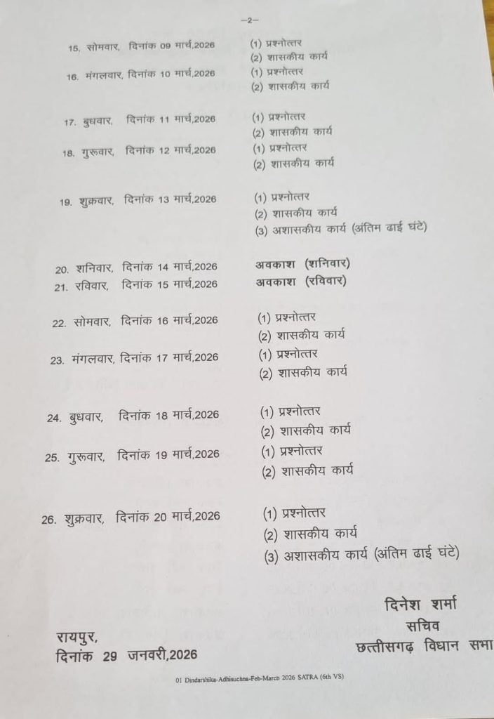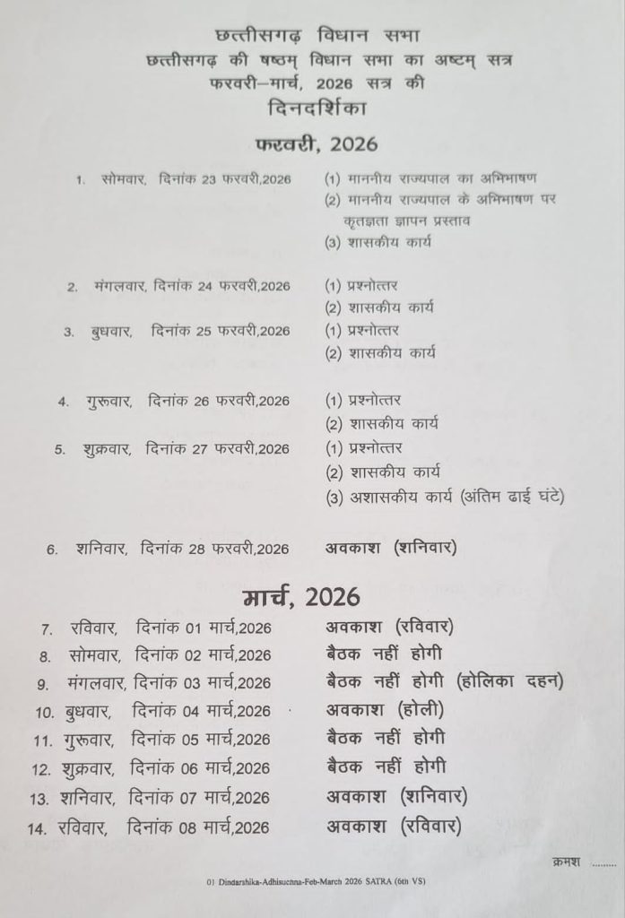रायपुर : छत्तीसगढ़ विधानसभा के आगामी बजट सत्र की तिथियां निर्धारित कर दी गई हैं। विधानसभा सचिवालय की ओर से जारी अधिसूचना के मुताबिक सत्र की शुरुआत 23 फरवरी से होगी, जो 20 मार्च तक चलेगा। पूरे सत्र के दौरान सदन की कुल 15 बैठकें प्रस्तावित हैं, जिनमें बजट सहित विभिन्न महत्वपूर्ण विषयों पर चर्चा की जाएगी। CG (Budget Session 2026)
