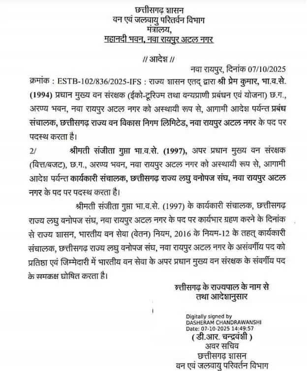 - एक अधिकारी, जैसे वी. वेंकटाचलम (2005 बैच) को मुख्य वन संरक्षक (व्यवस्थापन) एवं संचालक, गुरु घासीदास टाइगर रिजर्व अंबिकापुर नियुक्त किया गया है, साथ ही प्रभारी मुख्य वन संरक्षक (एलिफेंट), सरगुजा का अतिरिक्त प्रभार भी दिया गया है।