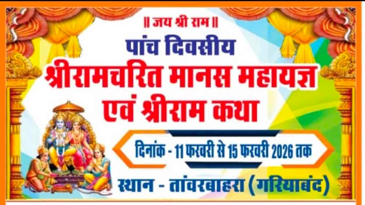 गरियाबंद। जिला मुख्यालय से लगे ग्राम ताँवरबाहरा में धर्म, आस्था और भक्ति का अद्भुत संगम देखने को मिलेगा। ग्रामवासियों के संयुक्त तत्वावधान में पांच दिवसीय श्रीरामचरित मानस महायज्ञ एवं श्रीराम कथा का भव्य आयोजन दिनांक 11 फरवरी से 15 फरवरी तक किया जा रहा है। इस धार्मिक आयोजन को लेकर पूरे गांव में उत्साह और श्रद्धा का वातावरण व्याप्त है।