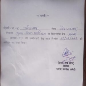 Dhamtari: कुरूद छत्तीसगढ़ कांग्रेस कमेटी के द्वारा सभी विधानसभा के उम्मीदवारों से निर्धारित प्रारूप में आवेदन 17 से 22 अगस्त तक ब्लाक अध्यक्ष के माध्यम से लिया जा रहा है। जिसके तहत कुरुद के युवा नेता कांग्रेस प्रतीक साहू वार्ड नंबर 07 से अपने और कांग्रेस के सभी समर्थकों के साथ ब्लाक कांग्रेस कमेटी अध्यक्ष आशीष शर्मा को अपना आवेदन पेश किया और प्रतीक साहू ने बताया कि सन् 1984 में माननीय प्रेमलाल साहू पूर्व मध्यप्रदेश में वरिष्ट कांग्रेस नेता के रूप में कुरूद विधानसभा के पूर्व नगर पालिका अध्यक्ष के पद पर नियुक्त रहे साथ ही सरकारी विपणन एवं प्रक्रिया संस्था कुरूद के भी अध्यक्ष पद पर रहे और साहू समाज के जिला स्तर के विभिन्न पदों पर एवं कुरूद विधानसभा में वरिष्ट पत्रकार के रूप में कार्यरत रहे चुके है। दादा की प्रेरणा लेकर पोते प्रतीक साहू ने राजनीति में कार्य कर रहे है और वर्तमान में छत्तीसगढ़ विधानसभा चुनाव 2023 विधायक पद के लिए दावेदारी प्रस्तुत किया है।