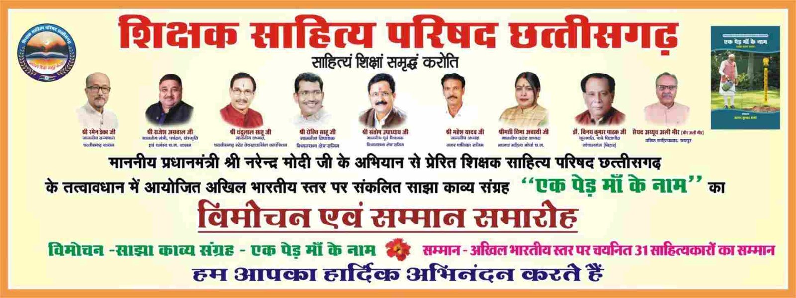 राजिम। एक पेड़ मां के नाम प्रधानमंत्री नरेंद्र मोदी के अभियान से प्रेरित होकर शिक्षक साहित्य परिषद छत्तीसगढ़ के तत्वावधान में साझा काव्य संग्रह एक पेड़ माँ के नाम के विमोचन एवं सम्मान समारोह का आयोजन आगामी 19 जनवरी 2026, सोमवार को प्रेमरत्न मैरिज पैलेस, गरियाबंद रोड, राजिम में किया जाएगा। यह आयोजन साहित्य, पर्यावरणीय चेतना एवं शिक्षक-सृजनशीलता का महत्वपूर्ण संगम होगा। आयोजन दो सत्रों में होगा। प्रथम सत्र में साझा काव्य संग्रह एक पेड़ माँ के नाम का विधिवत विमोचन छत्तीसगढ़ के माननीय राज्यपाल रमन डेका के करकमलों द्वारा किया जाएगा। वहीं चयनित रचनाकारों का सम्मान समारोह छत्तीसगढ़ शासन के पर्यटन एवं संस्कृति मंत्री राजेश अग्रवाल के मुख्य आतिथ्य में संपन्न होगा। कार्यक्रम की अध्यक्षता आदरणीय चंदूलाल साहू करेंगे, विशिष्ट अतिथि के रूप में राजिम विधायक रोहित साहू एवं पूर्व विधायक संतोष उपाध्याय, प्रदेश अध्यक्ष म.मो. विभा अवस्थी, कुलपति डॉ विनय पाठक,वरिष्ठ साहित्यकार मीर अली मीर की गरिमामयी उपस्थिति रहेगी। इस अवसर पर अखिल भारतीय स्तर पर आयोजित काव्य प्रतियोगिता में चयनित 31 साहित्यकारों का सम्मान किया जाएगा। आयोजन मंडल ने बताया कि प्रतियोगिता के लिए देश के विभिन्न राज्यों से लगभग साढ़े 650 कविताएँ प्राप्त हुई थीं, जिनमें से श्रेष्ठ रचनाओं का चयन किया गया। चयनित 31 रचनाकारों को शाल, श्रीफल, मोमेंटो, प्रशस्ति पत्र एवं ₹1100 की नगद राशि एवं प्रदान कर सम्मानित किया जाएगा। सम्मानित होने वाले रचनाकार पश्चिम बंगाल, उत्तर प्रदेश, गुजरात, केरल, आंध्र प्रदेश, राजस्थान, बिहार, उड़ीसा, तमिलनाडु एवं छत्तीसगढ़ सहित देश के विभिन्न राज्यों से हैं। साझा काव्य संग्रह “एक पेड़ माँ के नाम” में प्रतियोगिता से चयनित श्रेष्ठ 151 कविताओं का संकलन किया गया है, जिसका विधिवत विमोचन इसी समारोह में किया जाएगा। आयोजन मंडल के अनुसार छत्तीसगढ़ के 31 शिक्षक-साहित्यकारों द्वारा संयुक्त रूप से शिक्षक साहित्य परिषद छत्तीसगढ़ का गठन किया गया है। परिषद का उद्देश्य शिक्षकों की साहित्यिक प्रतिभा को मंच प्रदान करना तथा समाज में साहित्यिक, सांस्कृतिक एवं पर्यावरणीय चेतना का विस्तार करना है। परिषद का यह प्रथम आयोजन साहित्यिक जगत में एक महत्वपूर्ण पहल माना जा रहा है। कार्यक्रम दोपहर 12 बजे से प्रारंभ होगा। आयोजन मंडल ने साहित्यकारों, शिक्षकों एवं साहित्य प्रेमियों से अधिक संख्या में उपस्थित होकर आयोजन की गरिमा बढ़ाने की अपील की है।
